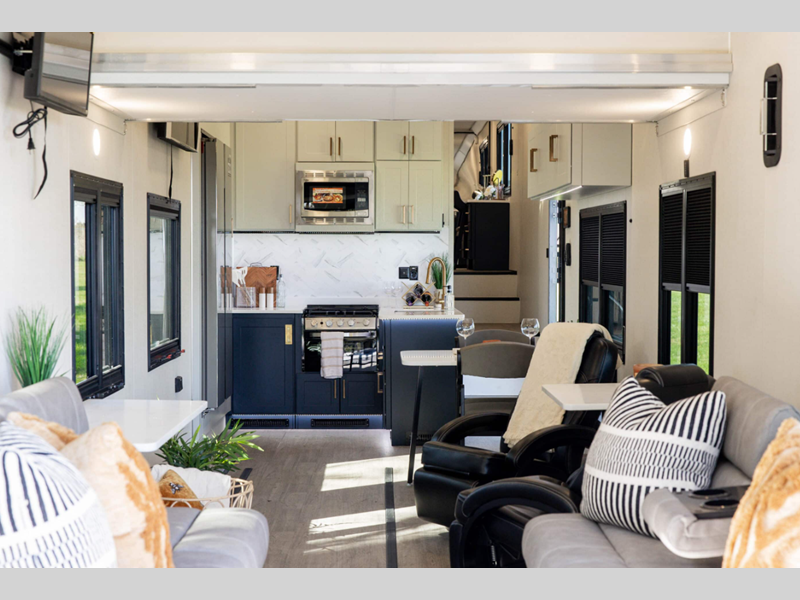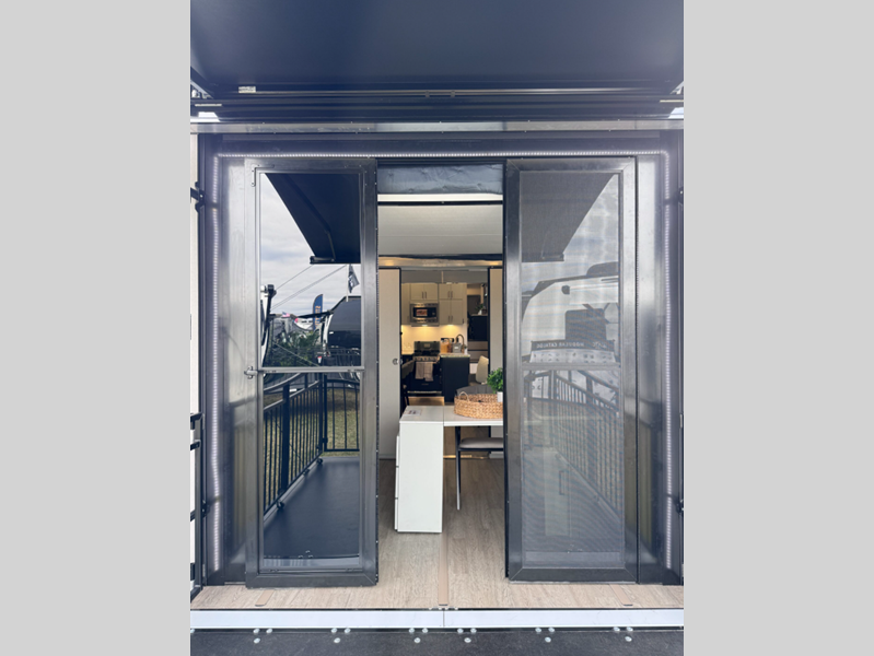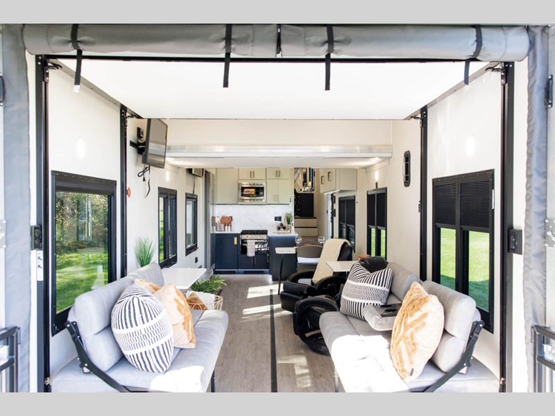 The LifeTrac Modular Component System and garage tie-downs will let you configure your space for furniture, toys, gear, and more! There is composite and commercial-grade vinyl flooring inside, along with aluminum cabinets and solid surface countertops, glass shower doors, and a residential bed for all-around comfort. The exterior is just as accommodating with its pass-through storage, power awning with LED lights, hydraulic leveling system, and a GenY Hitch to name a few conveniences.
