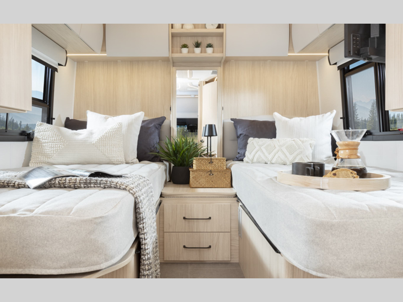 Sleeps 2 Length 25 ft 1 in Ext Width 7 ft 11 in Ext Height 10 ft 6 in Int Height 6 ft 4 in Interior Color Dove, Sand, Clay Exterior Color Euro Sport, Silver, Diamond White, Glacier, Atlantic Blue GVWR 11030 lbs Fresh Water Capacity 36.5 gals Grey Water Capacity 35 gals Black Water Capacity 30.6 gals Furnace BTU 19000 btu Fuel Type Diesel Engine 2.0-L Turbocharged I-4 Diesel Chassis Mercedes-Benz Sprinter 3500 Horsepower 208 hp Fuel Capacity 24.5 gals Wheelbase 170 in Available Beds Two Twin Torque 332 ft-lb Refrigerator Type 12V Compressor Refrigerator w/Bottom Freezer Convection Cooking Yes Cooktop Burners 2 Number of Awnings 1 LP Tank Capacity 15.8 gals Water Heater Type Truma AquaGo Comfort Plus AC BTU 13500 btu Basement Storage 57 cu. ft. TV Info LR 27" TV, BR 24" TV Awning Info Powered Legless Box w/Wind Sensor and LED Ligts Shower Type Standard Similar Floorplans