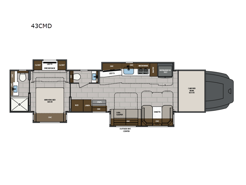Sleeps 7 Slides 4 Length 43 ft Int Height 0 ft 6 in Interior Color Summit, Ridgeline, Ascent Exterior Color Unpainted White or 3-Tier Paint Personalization Fresh Water Capacity 150 gals Grey Water Capacity 75 gals Black Water Capacity 75 gals Generator 12.5 kW Onan Quiet Diesel Fuel Type Diesel Number Of Bunks 1 Available Beds Mini King Refrigerator Type French Door Residential w/Stainless Steel Doors Refrigerator Size 18 cu ft Convection Cooking Yes Cooktop Burners 2 Number of Awnings 1 Water Heater Type AquaHot 450D Hydronic TV Info LR 4K Smart LED TV, BR 4K Smart LED TV, Ext. 43" Smart LED TV Awning Info Roof Mounted Girard 2 Stage Lateral Arm w/LED Lights Washer/Dryer Available Yes Shower Type Standard Electrical Service 50 amp Similar Floorplans