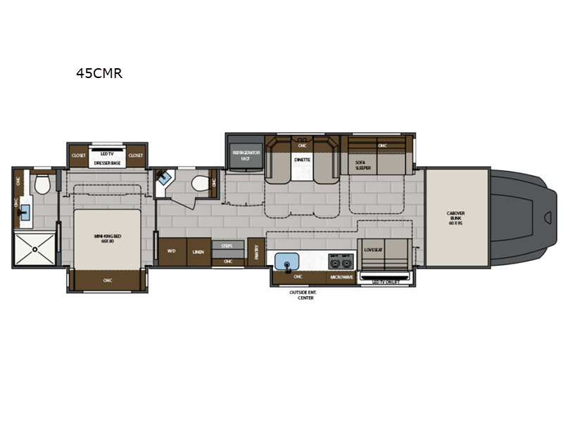 Sleeps 8 Slides 4 Length 45 ft Int Height 0 ft 6 in Interior Color Summit, Ridgeline, Ascent Exterior Color Unpainted White or 3-Tier Paint Personalization Fresh Water Capacity 150 gals Grey Water Capacity 75 gals Black Water Capacity 75 gals Generator 12.5kW Onan Quiet Diesel Fuel Type Diesel Number Of Bunks 1 Available Beds Mini King Refrigerator Type French Door Residential w/Stainless Steel Doors Refrigerator Size 18 cu ft Convection Cooking Yes Cooktop Burners 2 Number of Awnings 1 Water Heater Type Aqua Hot 450D Hydronic TV Info LR 4K Smart LED TV, BR 4K Smart LED TV, Ext. 43" Smart LED TV Awning Info Roof Mounted Girard 2 Stage Lateral Arm w/LED Lights Washer/Dryer Available Yes Shower Type Standard Electrical Service 50 amp Similar Motor Home Super C - Diesel Floorplans