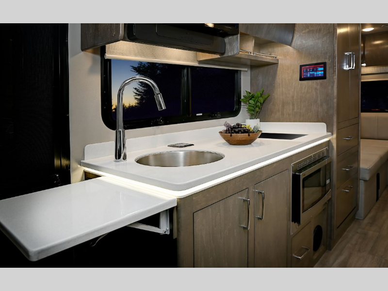 Sleeps 5 Slides 1 Length 25 ft 6 in Ext Width 7 ft 9 in Ext Height 11 ft Int Height 6 ft 8 in Interior Color Athens, Cyprus, Tuscany Exterior Color Avalon, Geneva, Olympia, Telluride, Tundra, Polaris, Atlas LR, Mojave Hitch Weight 4200 lbs GVWR 11030 lbs Fresh Water Capacity 34 gals Grey Water Capacity 29 gals Black Water Capacity 29 gals Furnace BTU 18000 btu Generator 3.6KW LP Gas w/Auto Start Fuel Type Diesel Engine High-Output 4-Cyliner Turbo Diesel Chassis Mercedes Benz 3500 Sprinter Fuel Capacity 24.5 gals Number Of Bunks 1 Available Beds Murphy Refrigerator Type 12V Compressor Refrigerator Size 8 cu ft Convection Cooking Yes Cooktop Burners 2 Number of Awnings 1 LP Tank Capacity 13.2 gals Water Heater Type Truma Comfort Plus Tankless AC BTU 13500 btu Basement Storage 42 cu. ft. TV Info LR 32" Smart LED TV, Ext. 27" LED TV Awning Info Lateral Arm w/Wind Sensor & LED Lights Shower Type Standard Electrical Service 30 amp Similar Floorplans