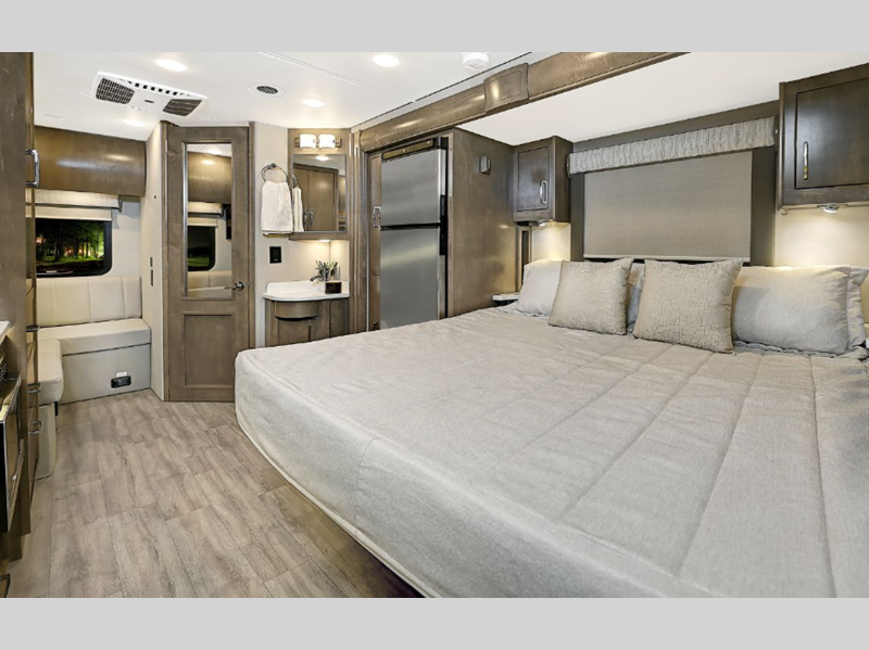 Each offers cab conveniences from the attention, brake and traffic sign assist, heated exterior mirrors, active lane keeping assist, the MBUX multimedia system with a 10.25" touchscreen, and wireless capabilities plus swivel, power and heated seats for maximum comfort. More interior highlights include Ultra leather furniture, accent lighting at the galley solid surface countertops, a Truma Comfort Plus tankless water heater, and premium vinyl flooring for easy care. You will love the two new exterior color options, along with new wood stains and flooring options.