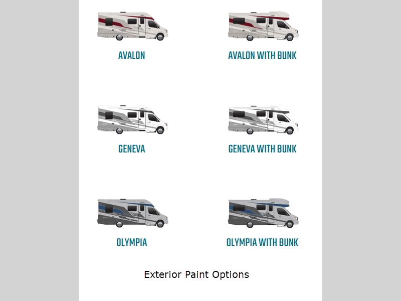 Sleeps 4 Slides 1 Length 25 ft 6 in Ext Width 7 ft 9 in Ext Height 11 ft Int Height 6 ft 8 in Interior Color Athens, Cyprus, Tuscany Exterior Color Avalon, Geneva, Olympia, Telluride, Tundra, Polaris, Atlas LR, Mojave Hitch Weight 4200 lbs GVWR 11030 lbs Fresh Water Capacity 34 gals Grey Water Capacity 29 gals Black Water Capacity 29 gals Furnace BTU 18000 btu Generator 3.6KW LP Gas w/Auto Start Fuel Type Diesel Engine High-Output 4-Cyliner Turbo Diesel Chassis Mercedes Benz 3500 Sprinter Fuel Capacity 24.5 gals Available Beds Murphy Refrigerator Type 12V Compressor Refrigerator Size 8 cu ft Convection Cooking Yes Cooktop Burners 2 Number of Awnings 1 LP Tank Capacity 13.2 gals Water Heater Type Truma Comfort Plus Tankless AC BTU 13500 btu Basement Storage 42 cu. ft. TV Info LR 32" Smart LED TV, Ext. 27" LED TV Awning Info Lateral Arm w/Wind Sensor & LED Lights Shower Type Standard Electrical Service 30 amp Similar Floorplans