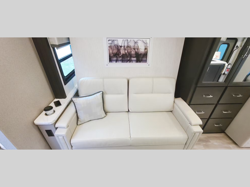 Sleeps 4 Slides 1 Length 35 ft 9 in Ext Width 8 ft 3 in Ext Height 12 ft 7 in Int Height 7 ft Interior Color Overlook, Morning Breeze Exterior Color Cityscape Edition ll Partial Paint. Clear Lake ll, Monterey Bay ll, Santa Ana Wind ll Full Body Paint Choices Hitch Weight 12000 lbs GVWR 22000 lbs Fresh Water Capacity 75 gals Grey Water Capacity 40 gals Black Water Capacity 40 gals Furnace BTU 30000 btu Generator Onan RV QD 6,000 Diesel Fuel Type Diesel Engine 6.7L Power Stroke 4 x 4 V8 Turbo Chassis Ford F600 Horsepower 330 hp Fuel Capacity 66.5 gals Wheelbase 252 in Number Of Bunks 1 Available Beds RV Queen Refrigerator Type Residential Cooktop Burners 3 Shower Size 34" x 34" Number of Awnings 1 LP Tank Capacity 68.2 lbs Water Heater Type Tankless AC BTU 27000 btu Basement Storage 152 cu. ft. TV Info Smart TV; Cab 40", BR 32", Ext. 32" Awning Info 20' Power with LED Lights Washer/Dryer Available Yes Gross Combined Weight 43500 lbs Shower Type Radius Electrical Service 50 amp Solar Wattage 500 watts Similar Floorplans