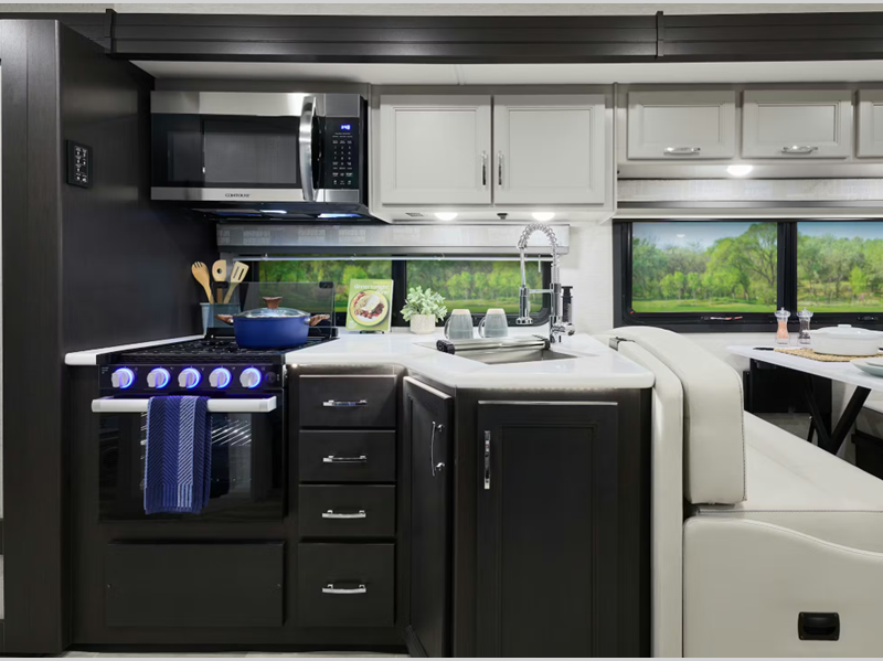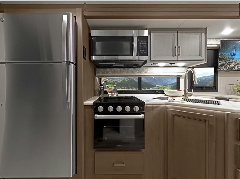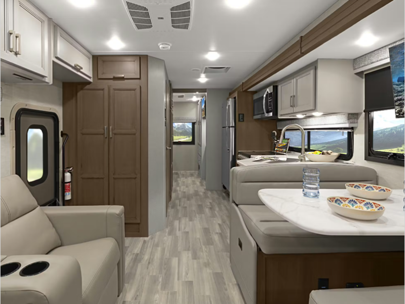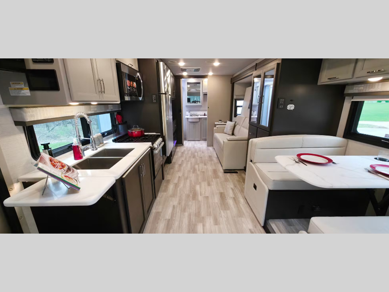 You will be able to tackle any adventure with the Power Stroke 4x4 turbo diesel engine and durable Ford F550 or F600 chassis, depending on the model you choose. There is also a 10,000 lb. or 12,000 lb. hitch to bring the family car along, plus added safety features such, as pre-collision assist and audible lane departure warning. Inside, the residential linoleum throughout will have you feeling right at home, along with Leatherette furniture, solid surface kitchen countertops, and a glass shower door in the bath.